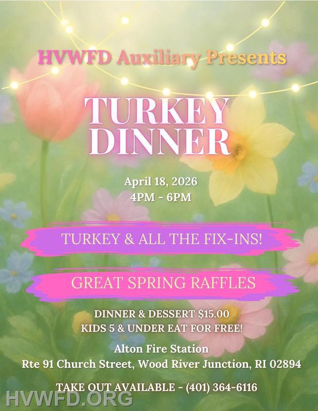 Our Auxiliary will be hosting their Annual Turkey Supper on Saturday, April 18th. Join us for a delicious meal at 350 Church Street (Alton Station 2) from 4–6 PM.
